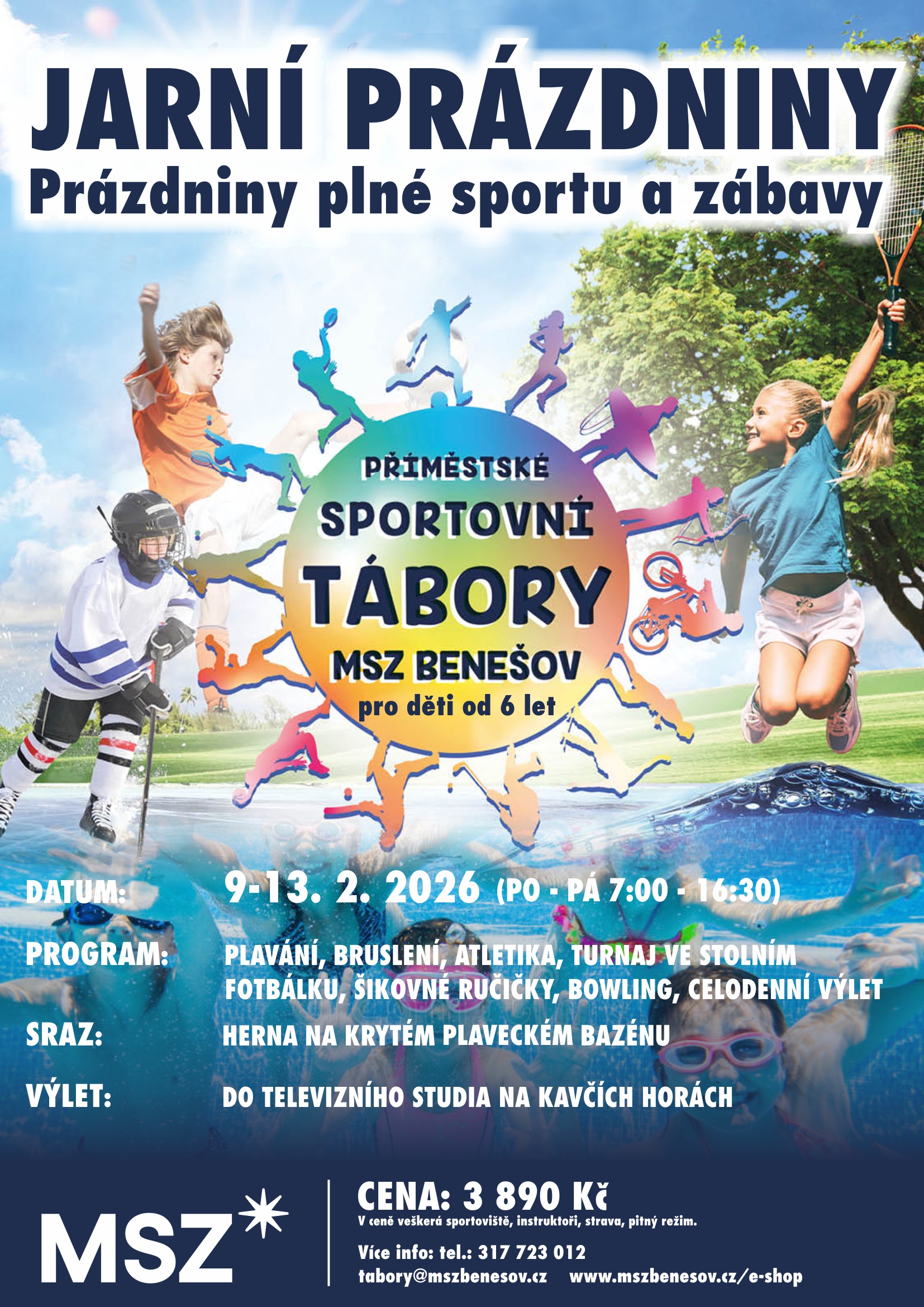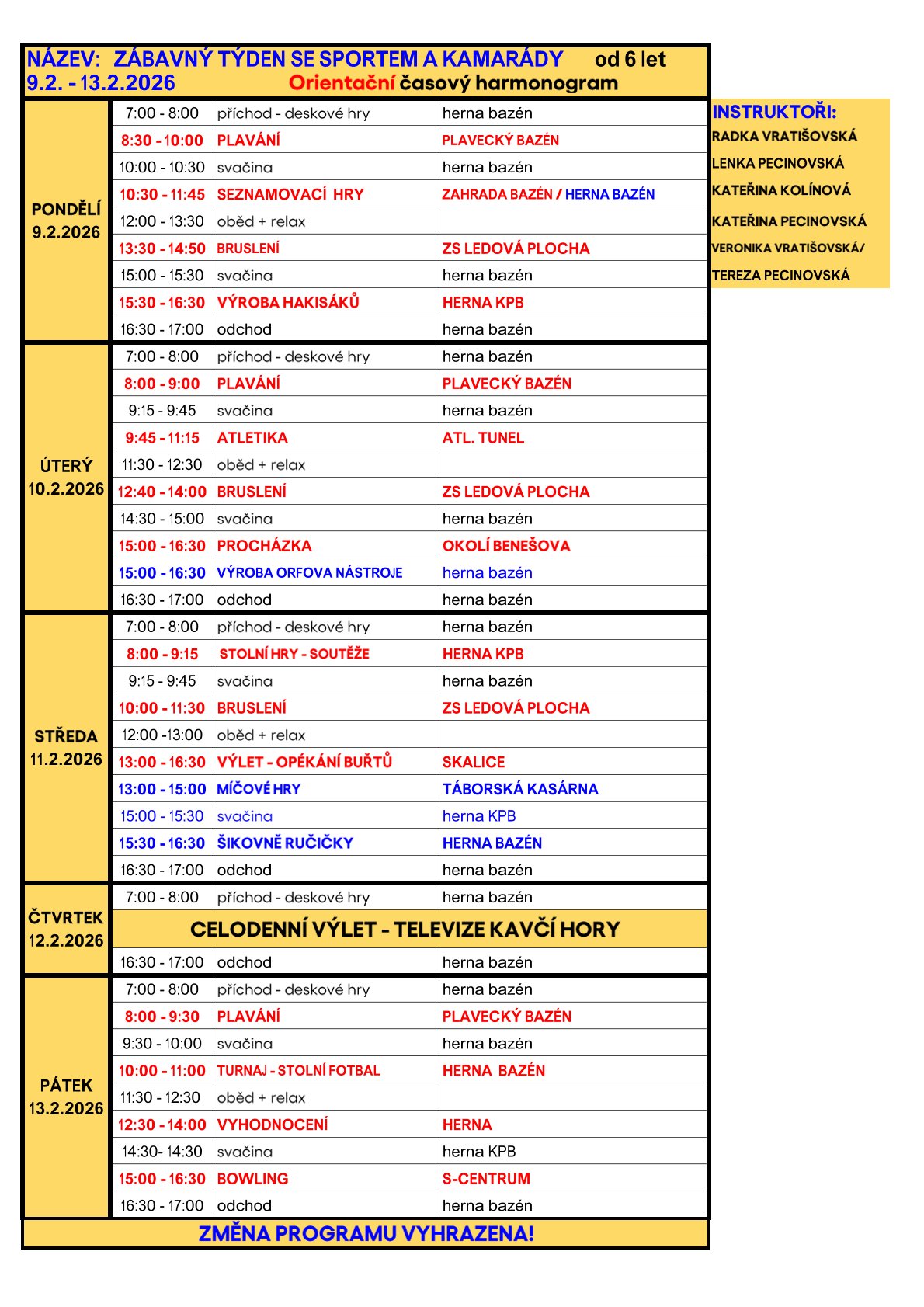 Program: plavání, bruslení, atletika, turnaj ve stolním fotbálku, šikovné ručičky, bowling, celodenní výlet